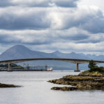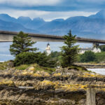 We finally got there and were rewarded with exactly ZERO coos. The video had shown a whole bunch along the roadways, but they must have been at Coo church (after all, it was Sunday) because they weren’t out anywhere we could see them. So, sadly, we decided to head back to Portree. That route took us over the Skye Bridge, which is an architectural marvel. Had to get pics of that and when I did, I saw this cool lighthouse under it so I got one of those.