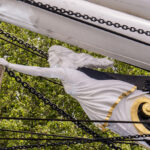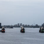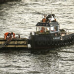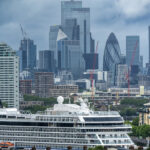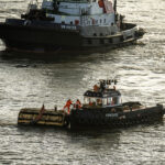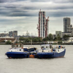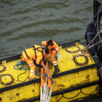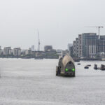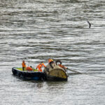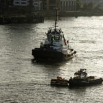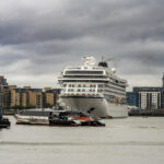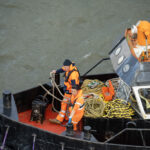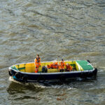 Leaving Greenwich differs from any sail away we have done in 35+ cruises. Usually, the seamen will slip the ropes and pull them in, and off you go. In Greenwich, because there is no pier and the ship is anchored in the middle of the river, it is moored to five huge buoys that are anchored to the river bottom. To bring in the ropes and untie the ship, a crew has to get onto each mooring buoy and untie the ropes. That became a long and entertaining process for those of us taking photos. I have a few shots to show you what I am talking about.