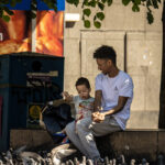 Dad and son feeding the pigeons.