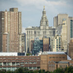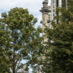 - The building with the spire is the courthouse where they film all those Law and Order step scenes.