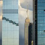 - The Empire State Building peeking out between two much more modern skyscrapers.